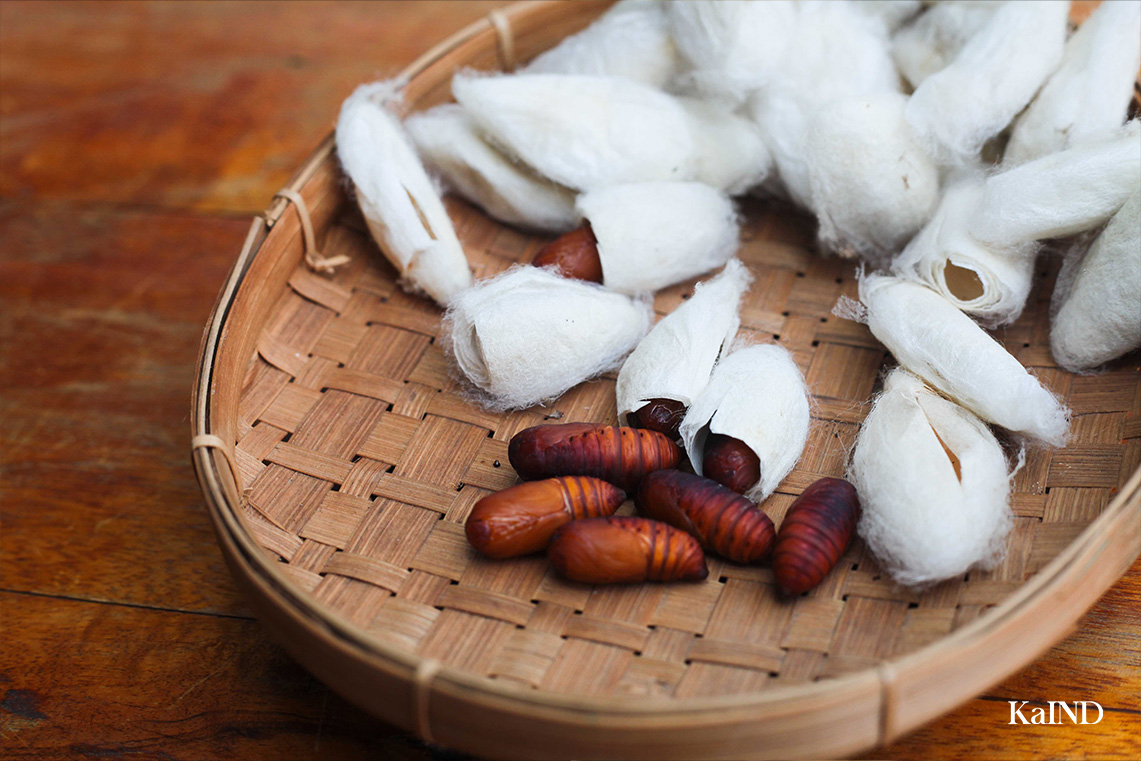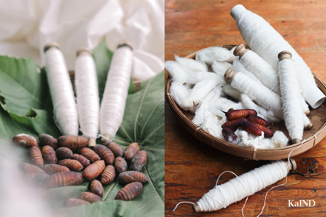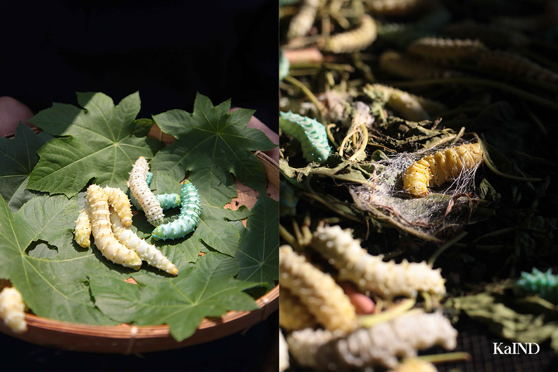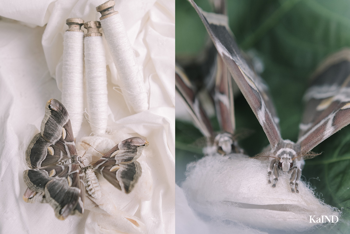 Eri Silk comes from the cocoon of Samia Cynthia Ricini moth and also is considered as wild silk. However, it can be domesticated just like what we have been doing with local silkworm farmers in Pasuruan. In doing so, they use humble methods such as cultivating the silkworm in bamboo hut and manually collecting castor leaves, the food of Eri Silkworm, from the surrounding vegetation. Thus, making the Eri silk fibers is 100% natural.